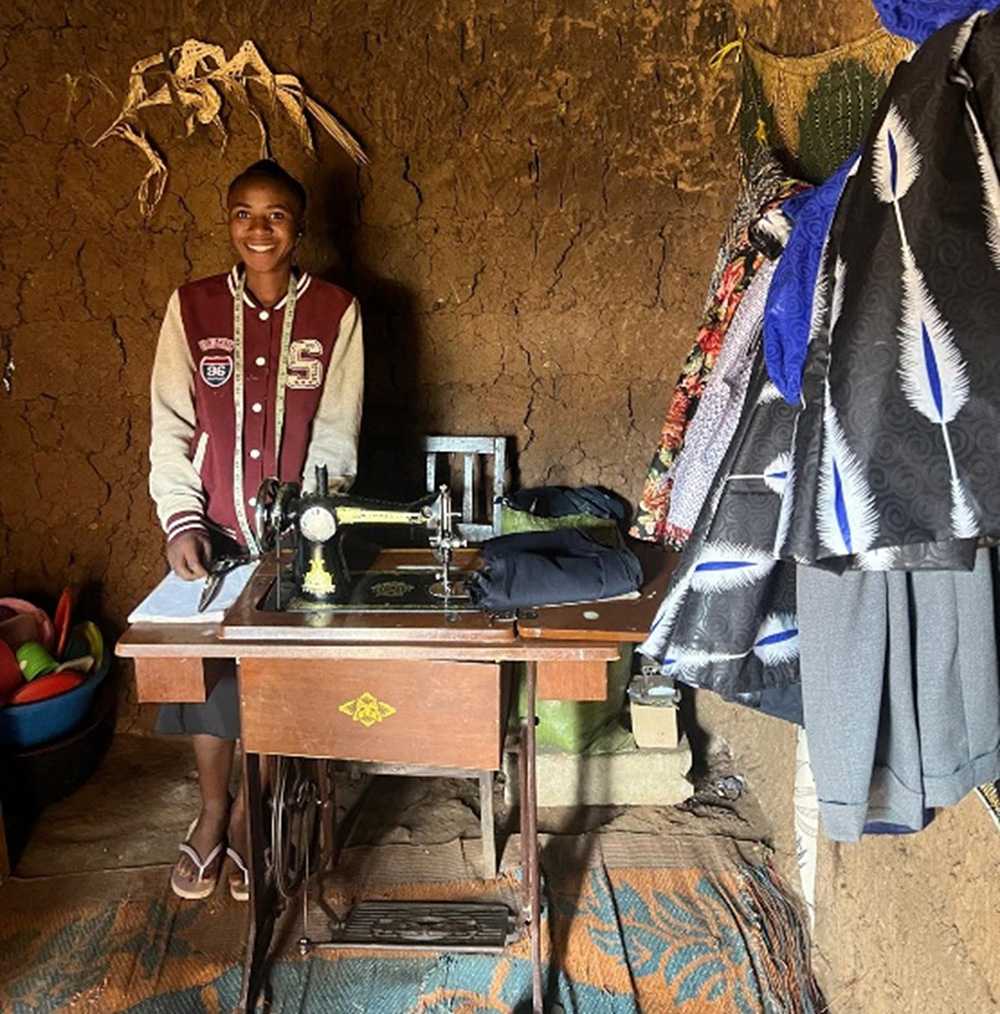 Nach Abschluss ihrer Ausbildung erhielt Grace vom Programm Startkapital. Mutig und entschlossen gründete sie in ihrem Dorf Ikokoto ein kleines Schneideratelier von zu Hause aus.
